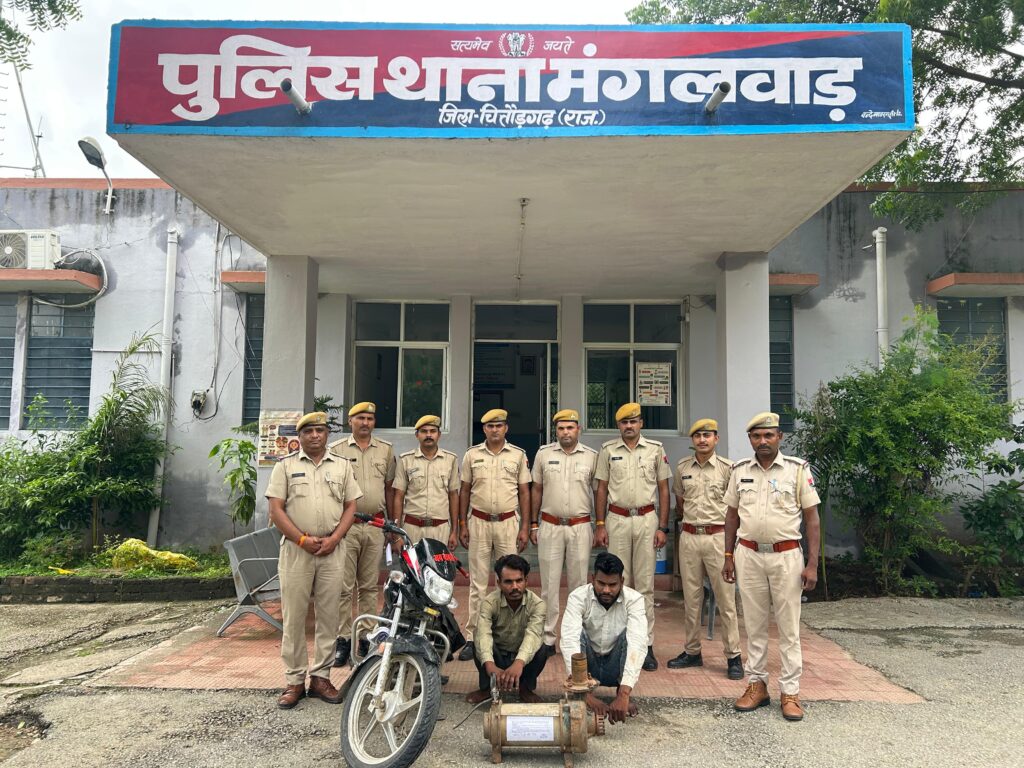 जिला पुलिस अधीक्षक द्वारा सम्पत्ति संबंधी अपराधो के विरूद्ध प्रभावी कार्यवाही करने के दिये गए निर्देशों की पालना में एएसपी सरितासिंह के निर्देशन व डीएसपी बडीसादडी देशराज कुलदीप आर.पी.एस. के सुपरविजन में थानाधिकारी पुलिस थाना मंगलवाड़ भगवान लाल पुलिस निरीक्षक के निर्देश पर एएसआई श्यामलाल व जाप्ता कानि नारायण सिंह, टंवरसिंह, गोमाराम, प्रेमाराम, भावेश व बलराम के रामनगर चौराहा पहुंचे, जहां मुखबीर से सुचना मिली कि वजीरपुरा की तरफ से दो लड़के पानी की मोटर चुराकर बेचने के लिये सारंगपुरा की तरफ बिना नंबरी मोटरसाईकिल के बिच में रखकर लेकर जा रहे है। सुचना विश्वसनिय होने से पुलिस जाप्ता के परमेश्वरपुरा, नौगांवा तथा सारगंपुरा तिराया पर पहुंच नाकाबंदी के दौरान एक बिना नम्बरी एचएफ डिलेक्स मोटरसाईकिल आई जिस पर दो व्यक्ति बैठे थे जो पुलिस जाप्ता को नाकाबन्दी करते देख घबरा गये, जिनको घेरा देकर रोककर बारी बारी से नाम पता पूछा तो मोटरसाईकिल चालक ने अपना नाम 26 वर्षीय मुकेश पुत्र गणेश भील उम्र 26 साल निवासी भाटोली ब्राहम्णान थाना निकुम्भ तथा पिछे बैठे व्यक्ति ने अपना नाम 32 वर्षीय जगदीशचन्द्र पुत्र छोगालाल भील निवासी वजीरपुरा थाना मंगलवाड़ जिला चितौड़गढ़ होना बताया। उक्त दोनों को बिच में रखी पानी की मोटर बारे में पूछने पर बताया कि वजीरपुरा की सरहद पर कुए से चोरी कर लाये है। पानी की मोटर तथा मोटरसाईकिल घटना में प्रयुक्त होने से जब्त किया गया। आरोपी मुकेश भील व जगदीशचन्द्र भील को मौके से गिरफ्तार किया गया। आरोपी जगदीशचन्द्र भील के विरूद्ध पुर्व में थाना निकुम्भ पर आर्म्स एक्ट का प्रकरण दर्ज है।